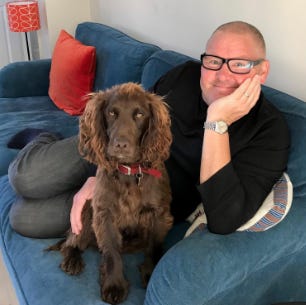 Hi I’m Chris and this is me on a settee in North Yorkshire, UK, with Öve the working cocker spaniel, back in 2018; days after crashing out of a previous life.